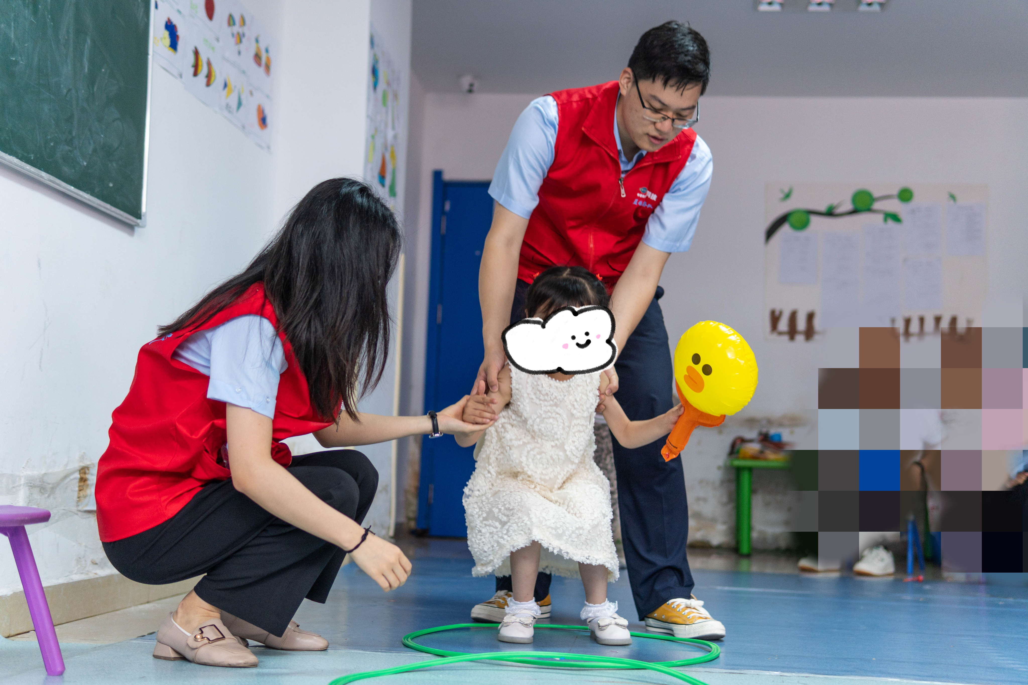 在康復中心老師的帶領下,志愿者們走進了孩子們學習和活動的教室,坐在了孩子們的身邊,看到這么多志愿者來到身邊,孩子們非常開心。在相互熟悉后,志愿者們帶著孩子們做起了游戲。在夏日的暖陽下,大朋友們牽起小朋友們的手,完成了小兔子跳圈圈、123木頭人、小腳踩大腳等游戲。臺上,大、小朋友傾力合作,完成挑戰;臺下,康復中心的老師和家長們笑聲不斷,不時送上熱烈的掌聲鼓勵與喝彩。